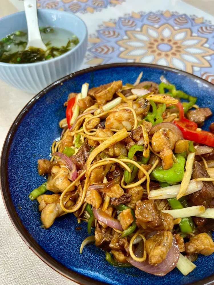 野生鳝丝炒面配汤